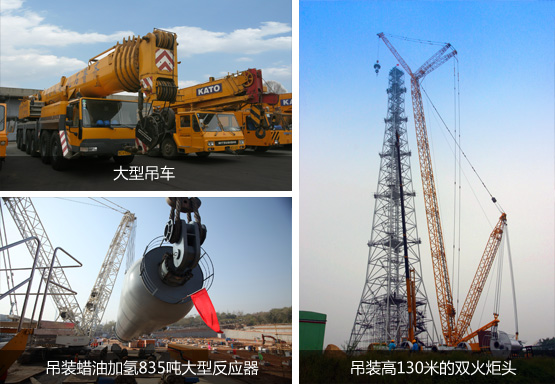 公司能夠安全高效地完成各類設備的起重吊裝工程,并能夠承擔大型設備吊裝“一體化”工程。近年來,通過各類大型吊車的優化利用,為加快提升公司的大型工程施工能力做出了重要貢獻。同時,吊車對外占有市場聲譽高漲,成效顯著。特別是TC2600型500噸大型吊車,10多年來完成了全國29個省市自治區,包括石化、鋼鐵、風電、煤化工及其他系統的大型設備、塔器、火炬等吊裝任務近百臺次,尤其是承建的齊魯分公司煉油廠加工高硫高酸原油適應性改造260萬噸/年蠟油加氫裝置總重達835噸的加氫處理反應器,以及340萬噸/年柴油加氫裝置改造總重達660噸的加氫精制第二反應器均實現了一次安全吊裝成功。公司能用一流的的吊裝技術為廣大客戶提供強有力的吊裝支持。