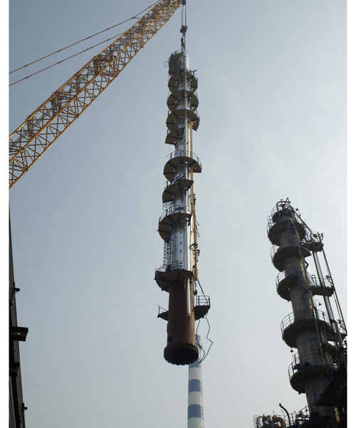 四年一次的齊魯石化大修改造中,煉油廠連續(xù)重整C-505塔更換是重點(diǎn)項(xiàng)目之一,為此,從公司、項(xiàng)目部到車(chē)間都高度重視,針對(duì)檢修時(shí)間緊實(shí)際,集中精干力量統(tǒng)籌優(yōu)化,采取模塊化施工,在吊裝前完成了附塔結(jié)構(gòu)、管線、勞動(dòng)保護(hù)和保溫的安裝,在盡量減少立塔后高空安裝工作量、降低安全風(fēng)險(xiǎn)的同時(shí),大幅縮短了一半工期。該塔重73噸,高52米,直徑1. 4米,塔壁只有17毫米,體型“瘦高苗條”,吊裝過(guò)程中變形風(fēng)險(xiǎn)大;吊裝需跨越操作室及空冷框架,就位安裝位置在設(shè)備、管線密集的設(shè)備區(qū)內(nèi),起吊高度近78米,吊裝半徑達(dá)50米,在吊裝作業(yè)中屬于難度少有的。因此,吊裝方案采用650噸履帶吊為主吊、260噸和120噸汽車(chē)吊配合,避開(kāi)施工高峰期,利用中午休息時(shí)間完成。最終,在現(xiàn)場(chǎng)領(lǐng)導(dǎo)、技術(shù)人員和施工人員精心組織、密切配合下,圓滿完成了吊裝任務(wù)。