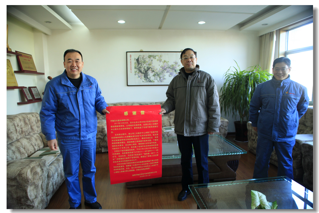 1月11日上午,淄博齊魯比歐西氣體有限責任公司領導專程送來感謝信,對我公司參加其裝置搶修表示感謝,對施工技術人員精湛的技術水平和一流的服務給予了高度評價。